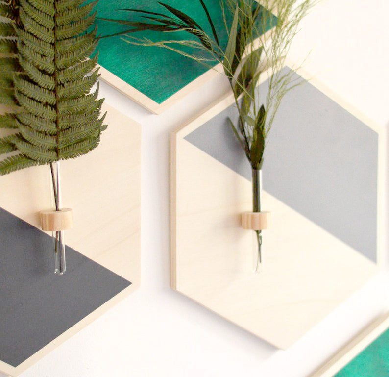 Set de 5 Hexágonos decorativos en verde y gris. Completamente hecho a mano, estas piezas son de madera de contrachapado de chopo y pintados manualmente con pintura acrílica respetuosa con el medio ambiente.