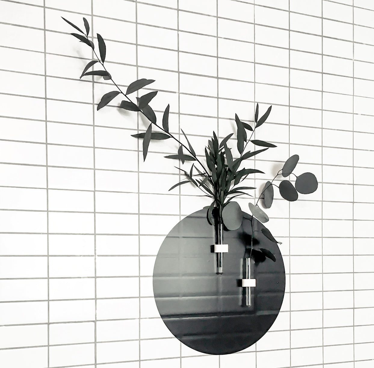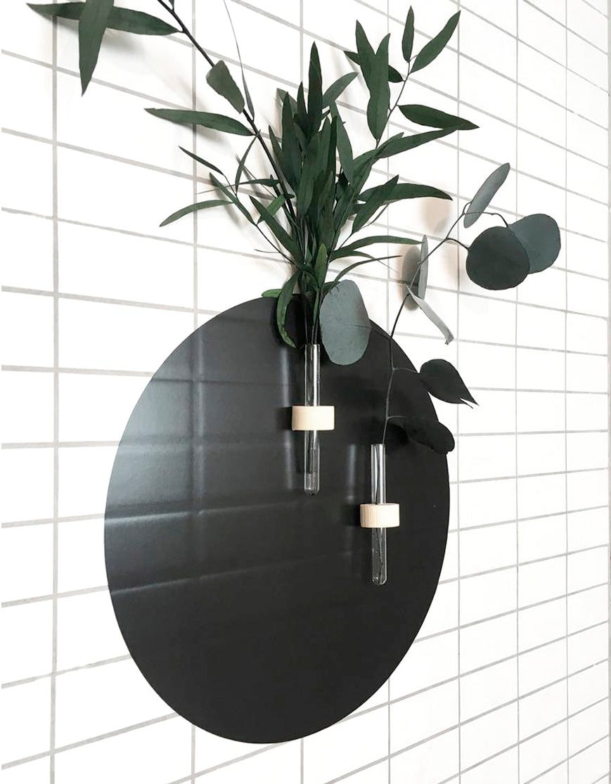 Vinilo Decorativo adhesivo de pared para interior. Éste vinilo se adhiere a cualquier superficie de interior y viene con un soporte de madera que contiene un jarroncito de cristal en el que puedes colocar tus plantas tanto secas como con agua.